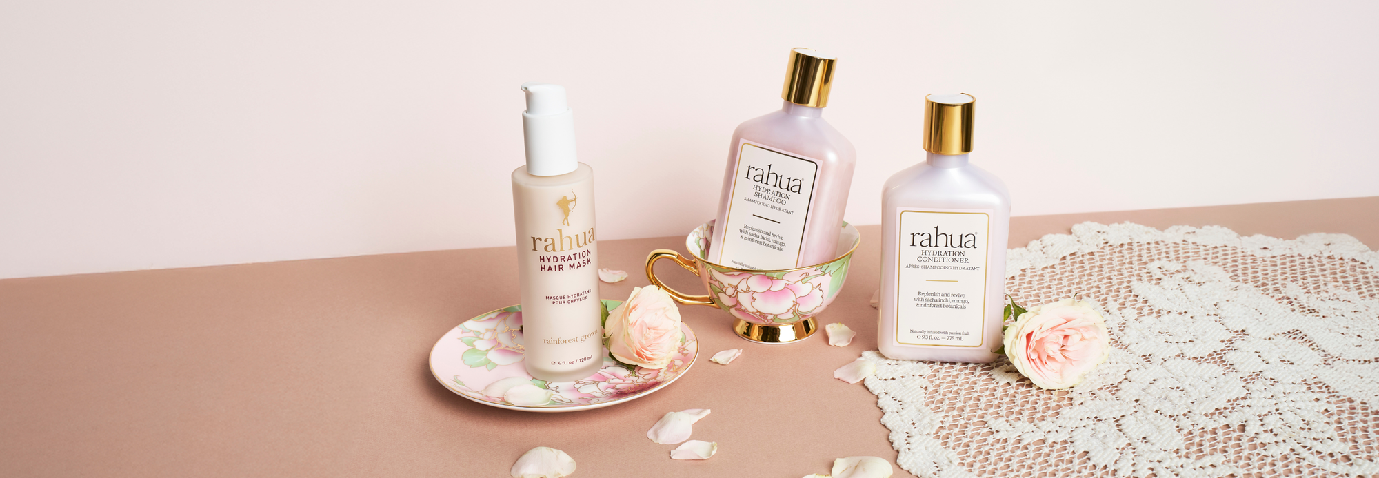 glass bottle of hydration hair mask on plain white background  Rahua Hydration Hair Mask|variant:4-oz model dispensing product onto their hand glass bottle of rahua hydration hair mask with a background of a waterfall|variant:4-oz